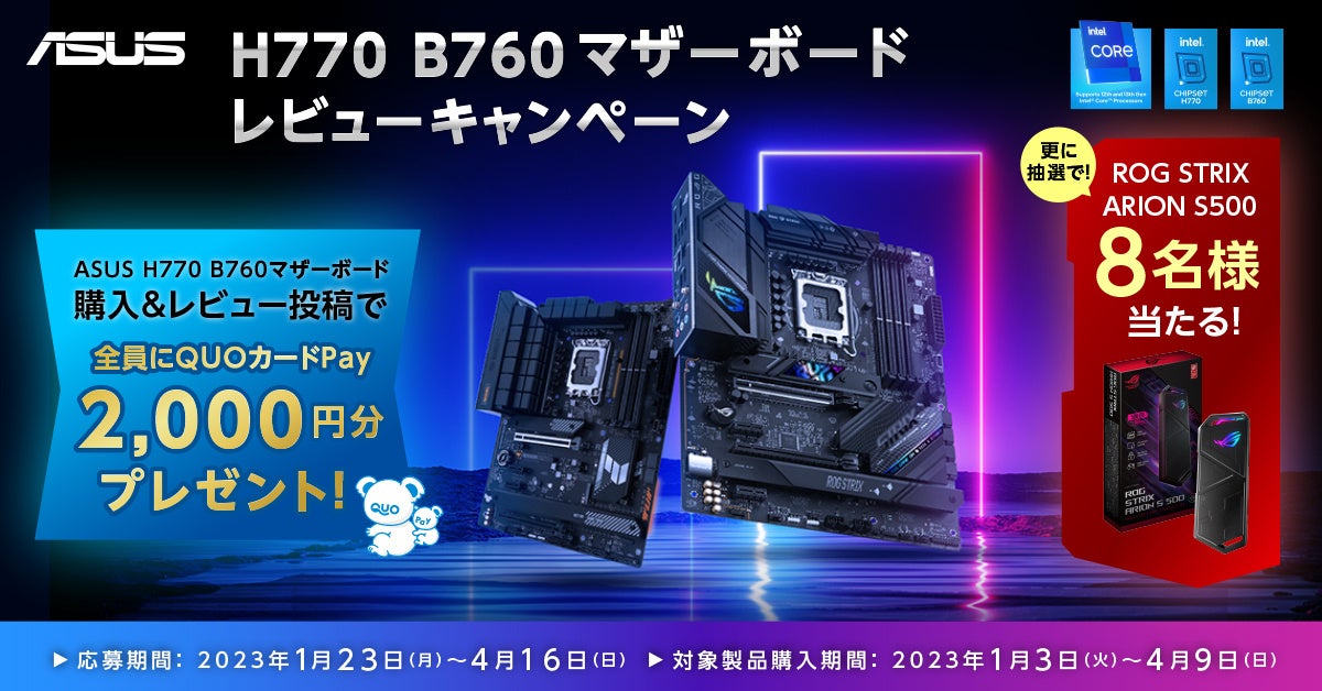 【キャンペーン】H770 B760シリーズマザーボードの購入&レビューで、QUOカードPay 2,000円分をプレゼント。更に抽選で8名様にROG STRIX ARION S 500をプレゼント!