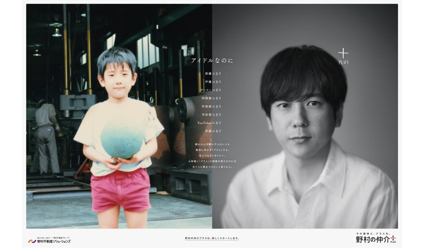 新たなスタートを宣言する今回のメインビジュアルでは、幼少期の二宮さんと現在の二宮さんの写真を並べ、“アイドルなのに”という見出しに続き俳優から作家まで様々な二宮さんの挑戦を綴っており、長年にわたってエンターテインメントの世界で多くのステークホルダーの期待に「プラス」して応えてきた軌跡を印象的に表現しています。