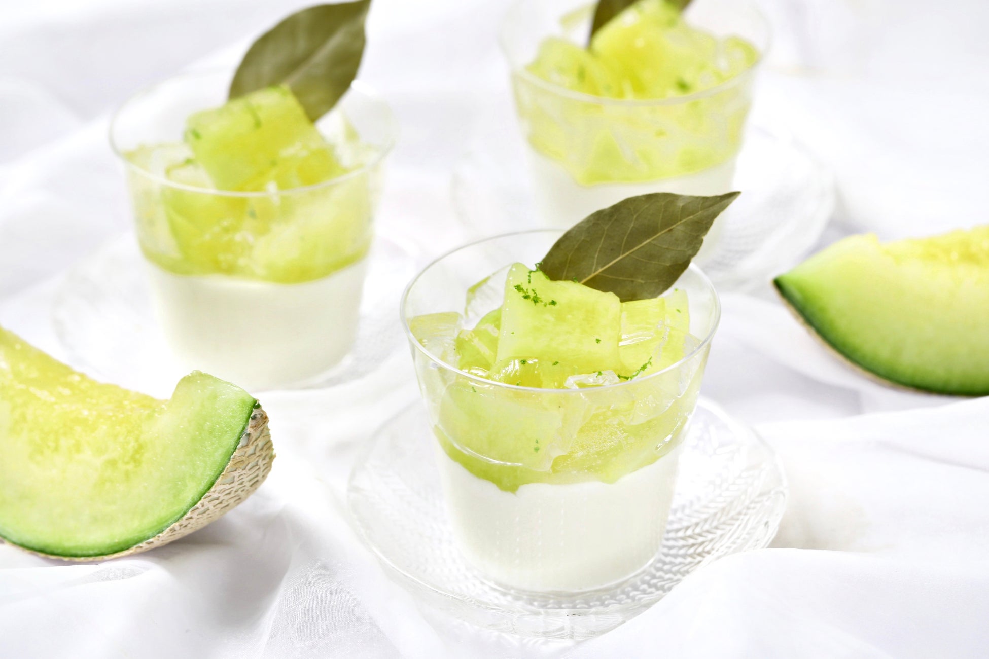 イムの皮で仕上げました。みずみずしく甘いメロンの果肉と、まろやかな杏仁豆腐の組み合わせをご