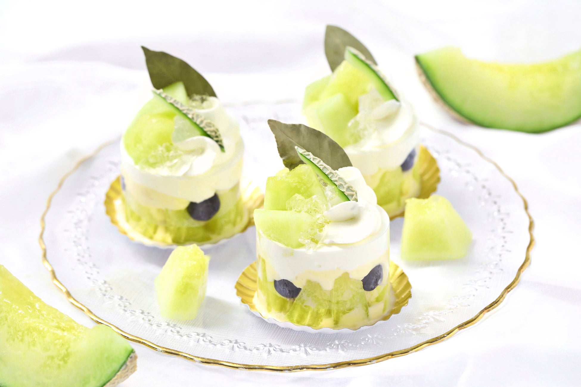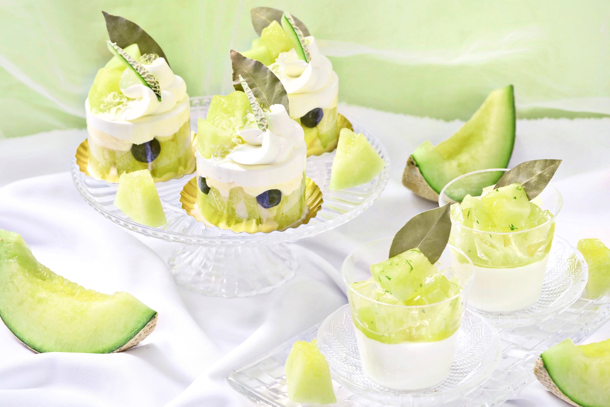 香り高く、果肉感あふれる国産のフレッシュメロンを使用し、華やかなビジュアルに仕立てました。初夏にぴったりの涼を誘う味わいは、一度召し上がるとあとを引くおいしさです。ピネードならではのまろやかな味わいのクリームと、メロンのコクのある甘さが絶妙なハーモニーの「メロンのショートケーキ プリンセス」。クリーミーで風味豊かな杏仁豆腐にレモンゼリーの味わいが爽やかな「メロンの杏仁豆腐」。