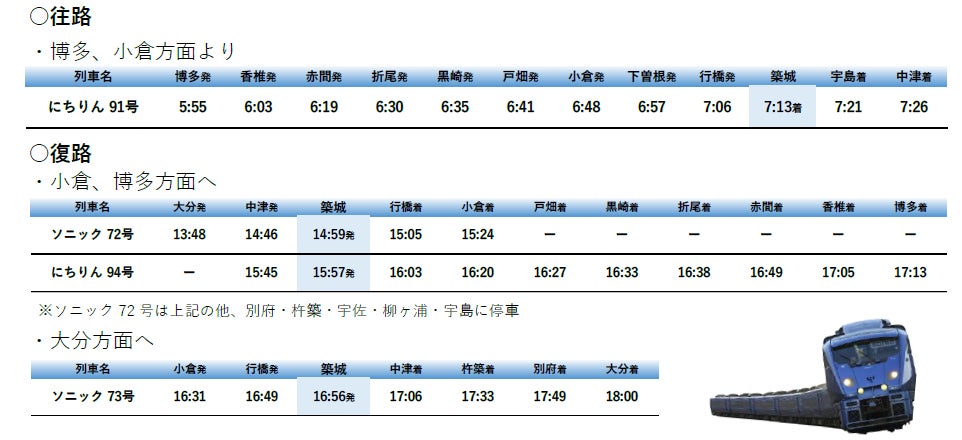 小倉・行橋~築城~宇島・中津間において、臨時普通列車を運転します。