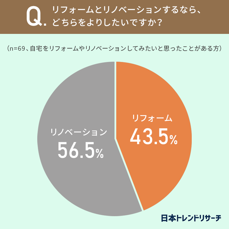 今回は「リフォームやリノベーション」に関するアンケートを行い、その結果について紹介しました。30.4%の方がリフォームとリノベーションの違いを認識しており、そのうちの43.5%が「リフォーム」、56.5%が「リノベーション」をしたいと答えています。