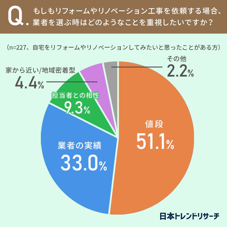 ■51.1%が「リフォームやリノベーション工事を依頼する場合、値段を最も重視する」