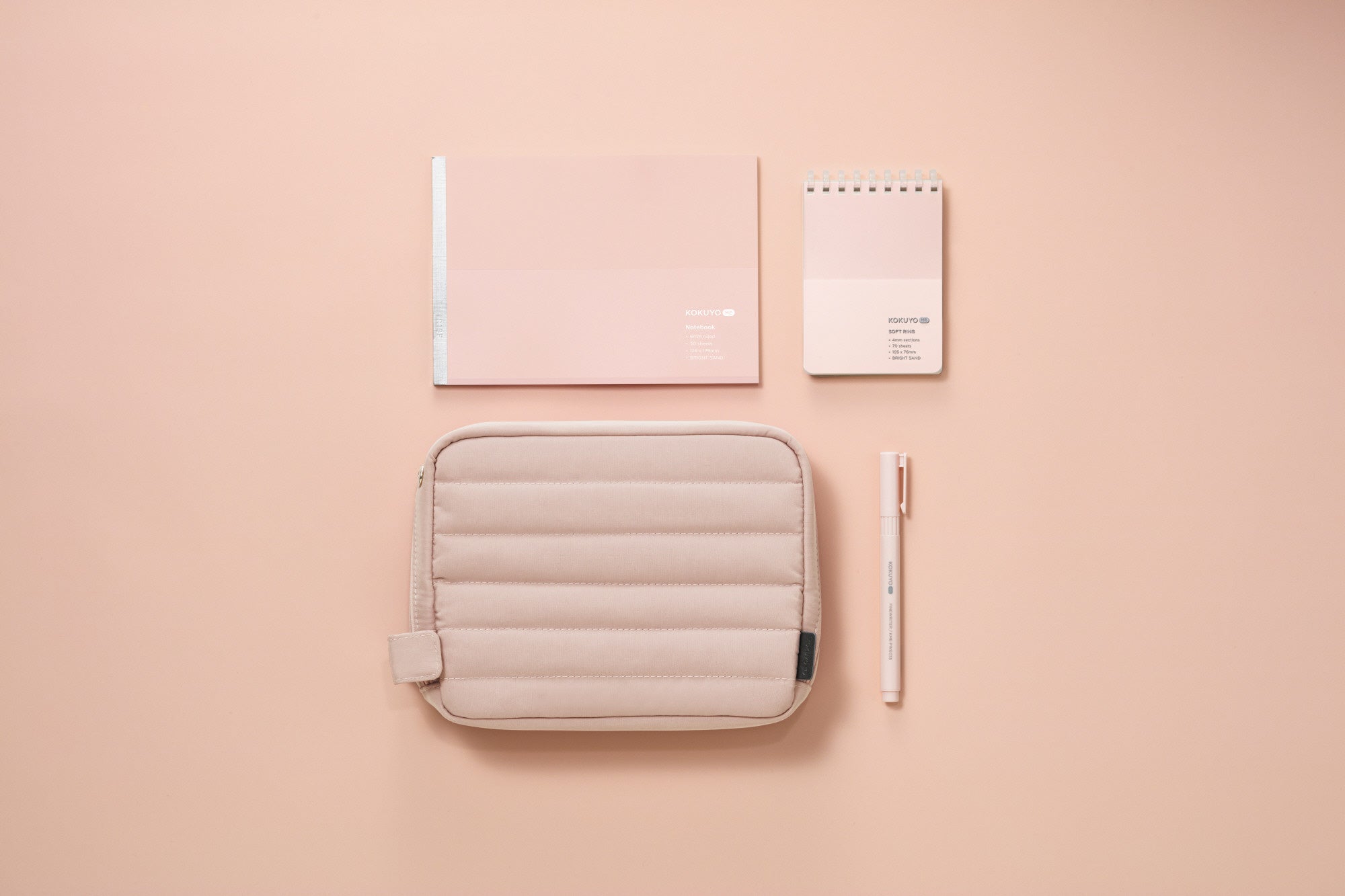ラインアップは、文具からイヤホン、マウスなどのガジェット類まで、ワークツールを一つにまとめて収容できる「スタンドツールポーチ」に加え、プラスチックのペン先で筆圧をかけずにスルスル書ける「ファインライター」と、ウェブ会議時にPC前のスペースでも置きやすい「ノートブックセミB5ハーフサイズ」、そしてリング部分が手に当たっても痛くなりにくい「ソフトリングメモ」をご用意しました。