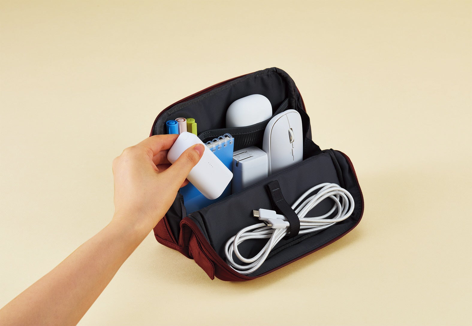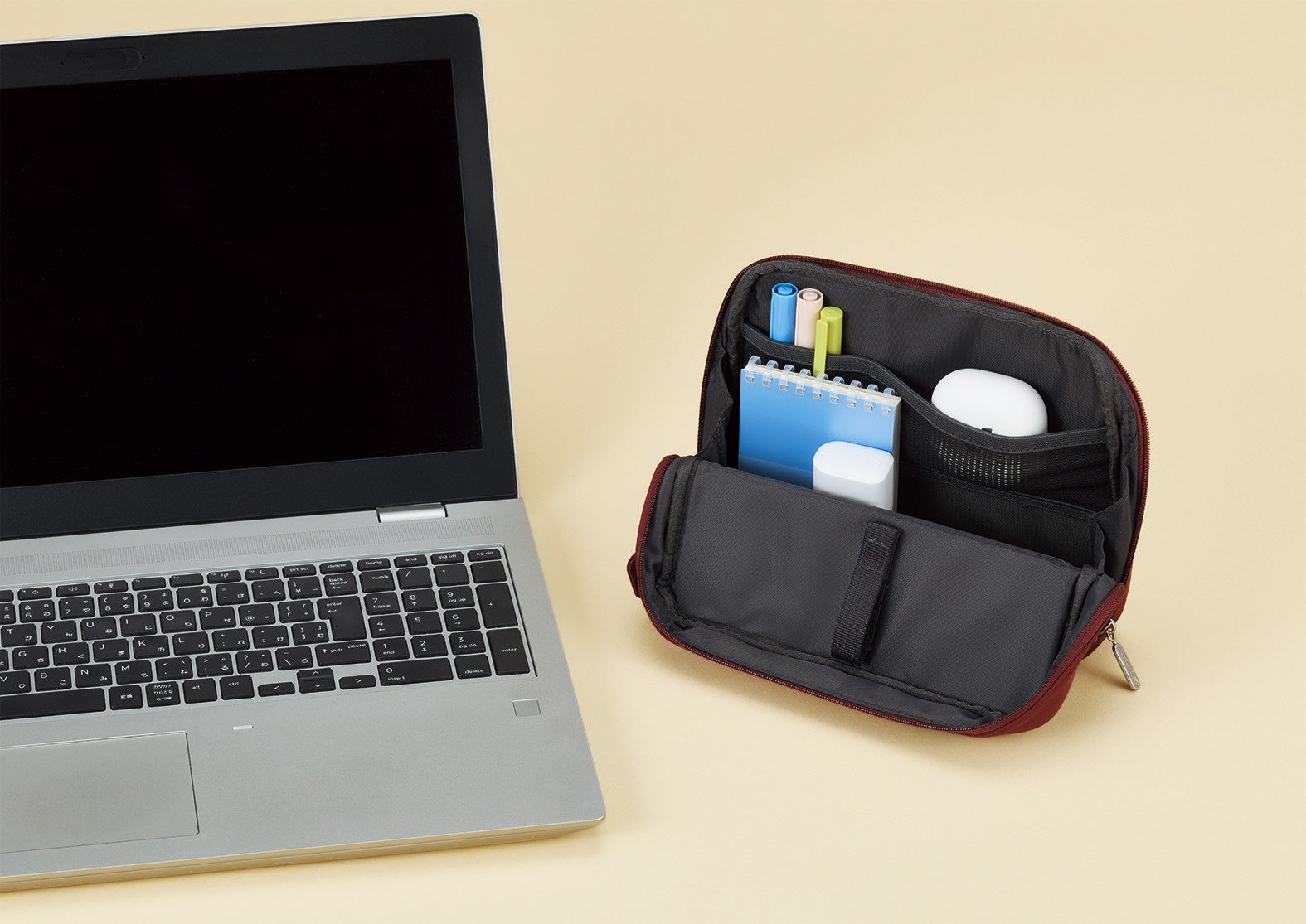 「スタンドツールポーチ」は、PCやデジタルツールの周辺機器も含めた持ち運びのしやすさを追求しました。デジタル関連製品を中心としたハードウェアを扱う「アンカー・ジャパン株式会社」の協力のもと選定した、ワーカーがよく持ち運ぶマウスやPC用充電器などのかさばりがちなガジェットを仕分けして整理できるケーブルホルダーや、インナーポケットを設置。同AW限定商品の「ファインライター」や「ノートブックセミB5ハーフサイズ」をはじめとする文具と、共同で選定したワークツールが相性よくすっきりまとまる仕様となっています。