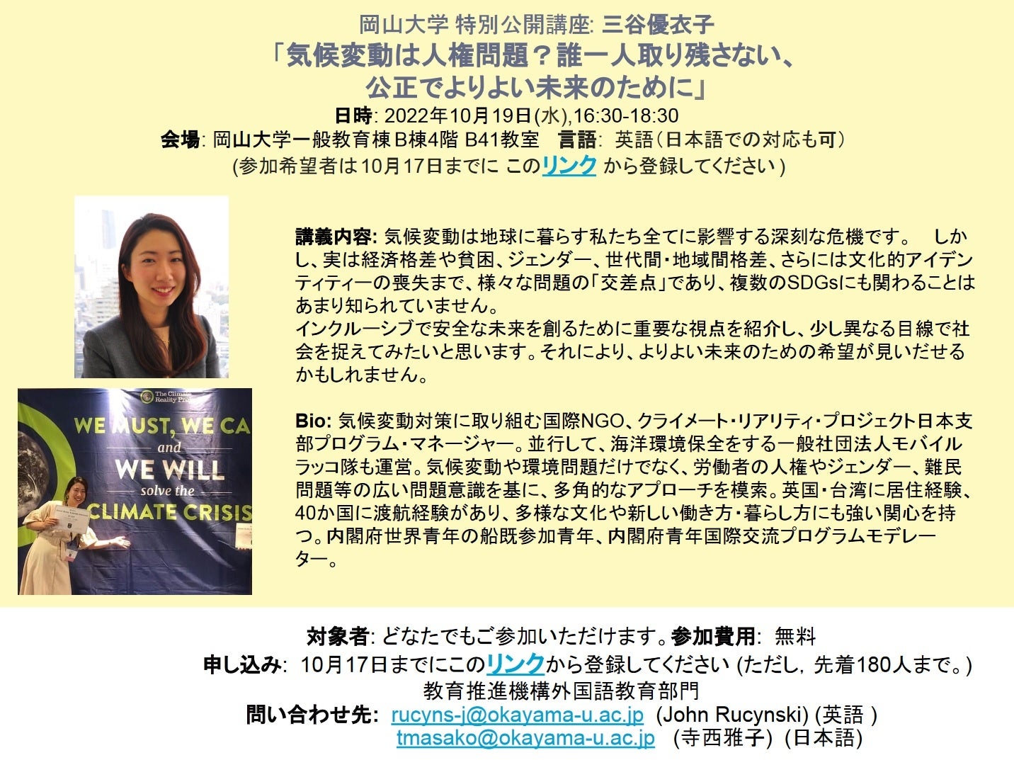 国立大学法人岡山大学(本部:岡山市北区、学長:槇野博史)の教育推進機構外国語教育部門では、2022年10月19日(水)に特別公開講座「気候変動は人権問題?誰一人取り残さない、 公正でよりよい未来のために」を、本学津島キャンパス(岡山市北区)にて開催します。
