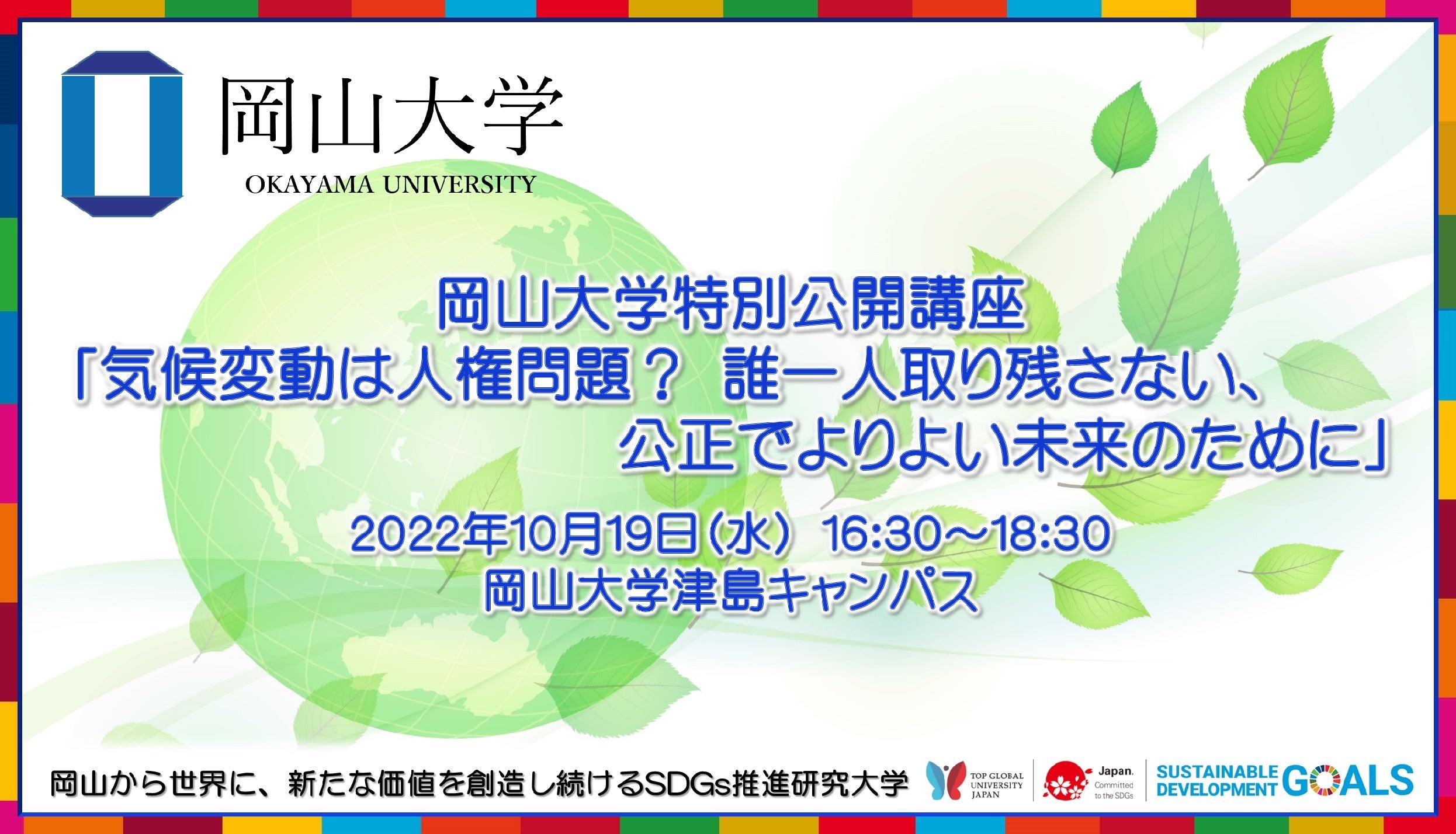 【岡山大学】特別公開講座「気候変動は人権問題?誰一人取り残さない、 公正でよりよい未来のために」〔10/19水, 岡山大学津島キャンパス〕