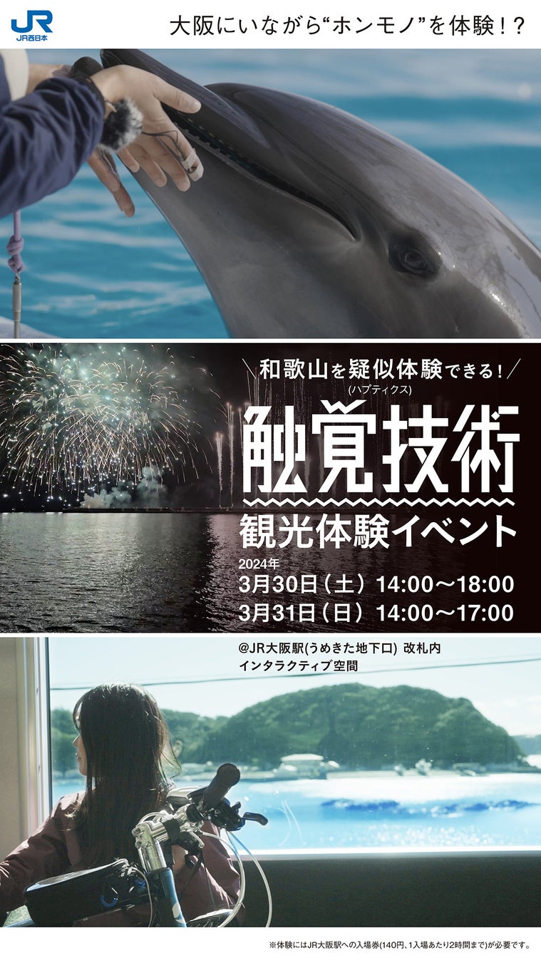 西日本旅客鉄道株式会社(本社:大阪市北区/代表取締役社長:長谷川 一明、以下「JR西日本」)、株式会社JR西日本コミュニケーションズ(本社:大阪市北区/代表取締役社長:伊藤 義彦、以下「Jコミ」)、株式会社NTTドコモ(本社:東京都千代田区/代表取締役社長:井伊 基之、以下「ドコモ」)、株式会社三菱総合研究所(本社:東京都千代田区/代表取締役社長:籔田 健二、以下「MRI」)は、大阪にいながら和歌山県内の観光スポットやイベントを、映像や音に加えて、“触覚”でも体感することのできる触覚技術(ハプティクス)観光体験イベント(以下、「本体験イベント」)を、2024年3月30日(土)・3月31日(日)の2日間にわたって、JR大阪駅(うめきたエリア)で実施いたします。