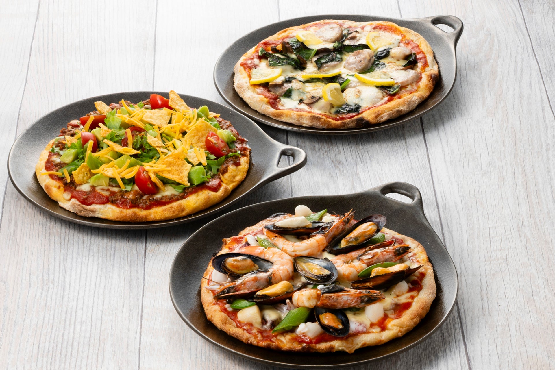 メインディッシュには、スパイスが香る「京都ぽーくのマセレ カレー風味のクスクス BBQスタイル」や3種のソースを添えた「ビーフカツレツ」など、ボリューム満点のお料理を月替わりでご提供します。そして、オープン当初から人気のオープンキッチンで仕上げるパスタは、和とイタリアンを融合した「山椒香る牛肉と茄子のボロネーゼ」や「鶏もも肉とガーリックのパスタ」をご用意します。また、店内の釜で焼き上げる米粉や大豆粉を使用したピザのような「ヴィスキオピンサ」は、海鮮をトッピングした「ピンサペスカトーレ」や「タコライス風ピンサ」など、オリジナリティあふれるメニューをお楽しみください。