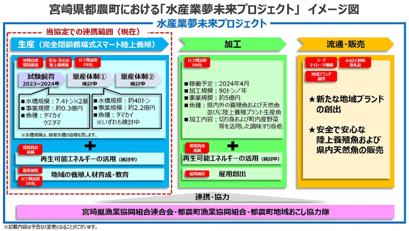 今回の成果をもとに、「水産業夢未来プロジェクト」の推進と実現に向けて、都農町漁協など地域の水産事業者等との連携により、完全閉鎖循環式スマート陸上養殖における「タマカイ」の本格的な量産体制の構築、2024年春に竣工予定の加工場の活用および都農町の新たな特産品の商品化・販売の実現、新たな地域ブランドの創出に向けた取り組みを進めてまいります。
