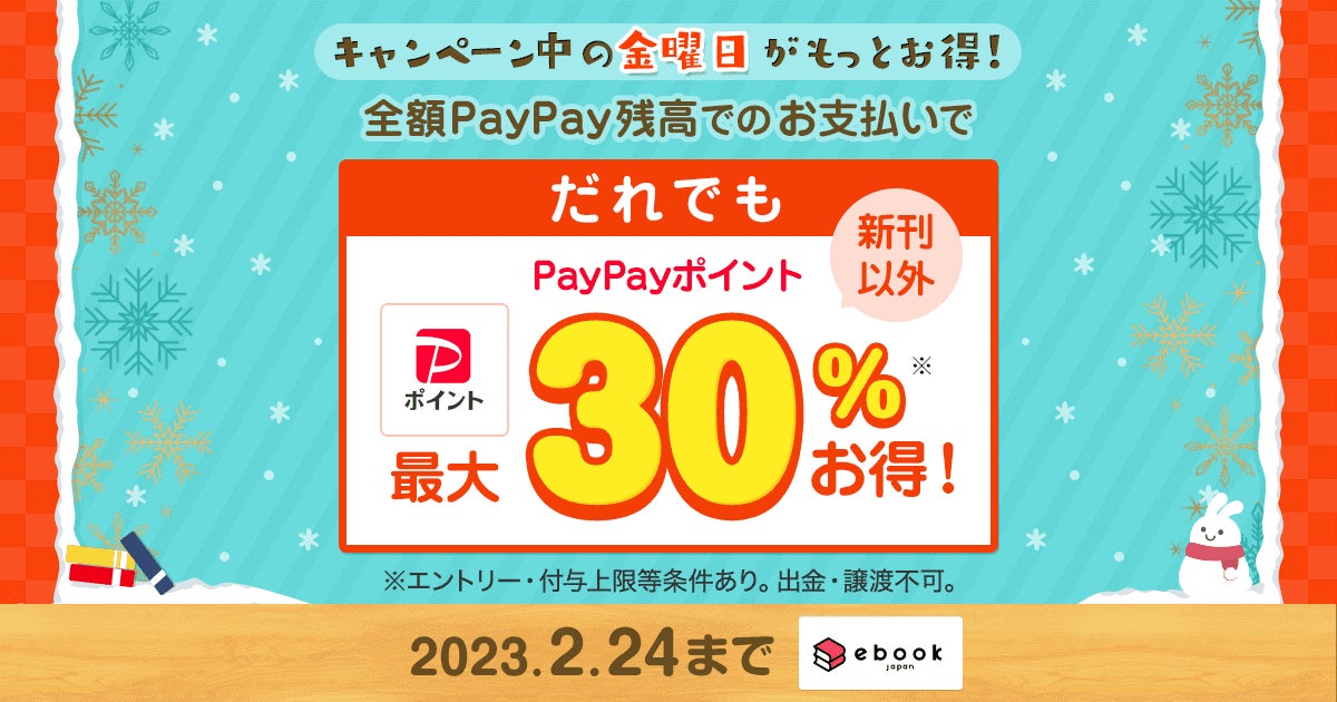 電子書籍販売サイト「ebookjapan」をヤフー株式会社と協力して運営する株式会社イーブックイニシアティブジャパンは、ebookjapanで「PayPay残高」を利用し電子書籍を購入すると、決済金額に対してだれでも最大30%お得になる「金曜日は全額PayPay残高決済の購入でもっとお得キャンペーン」を、2023年1月13日(金)から2023年2月24日(金)の毎週金曜日に実施します。