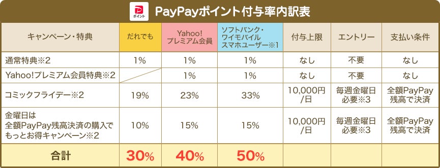 今回の「金曜日は全額PayPay残高決済の購入でもっとお得キャンペーン」と組み合わせることで、期間中の金曜日に「PayPay残高」で電子書籍を購入すると、だれでも最大30%、Yahoo!プレミアム会員は最大40%、ソフトバンクもしくはワイモバイルスマホユーザーは最大50%お得になります。このお得な機会にぜひご利用くださいませ。