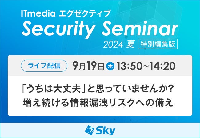 Sky株式会社は、9月19日(木)に開催される、ITmedia エグゼクティブ主催のライブ配信セミナー「ITmedia エグゼクティブ セキュリティセミナー 2024 夏 特別編集版 DXに走る日本企業──サイバーセキュリティの強化が経営の最重要課題に」に協賛いたします。