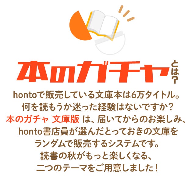 honto本の通販ストアで販売している文庫本約6万タイトルの中から、書店員が選んだとっておきの文庫をランダムでお届けする企画商品。価格とテーマのみで本を選ぶドキドキ感が話題を呼び、2022年8月に発売した第1弾は即日完売しました。気になるテーマから生まれる偶然の本との出会いをお楽しみください。