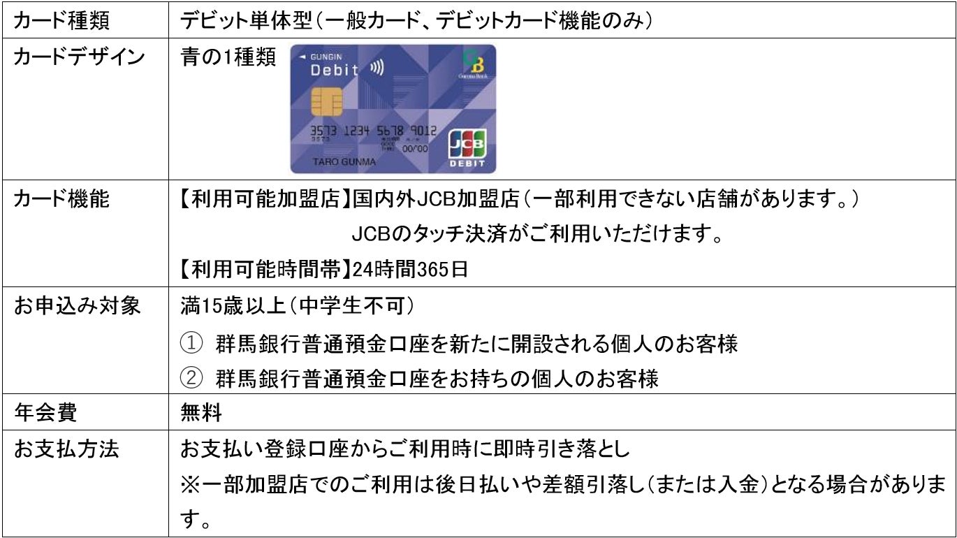 株式会社ジェーシービー (本社:東京都港区、代表取締役兼執行役員社長:二重 孝好、以下:JCB)は、株式会社群馬銀行(本社:群馬県前橋市、代表取締役頭取:深井 彰彦、以下:群馬銀行)および株式会社群銀カード(本社:群馬県前橋市、代表取締役社長:渡辺 紀幸、以下:群銀カード)と、2024年1月29日(月)より群馬銀行の口座保有者を対象としてJCBブランドデビットカード(以下、JCBデビット)の発行を開始します。なお、本カードは JCB のタッチ決済(JCBコンタクトレス)搭載カードです。