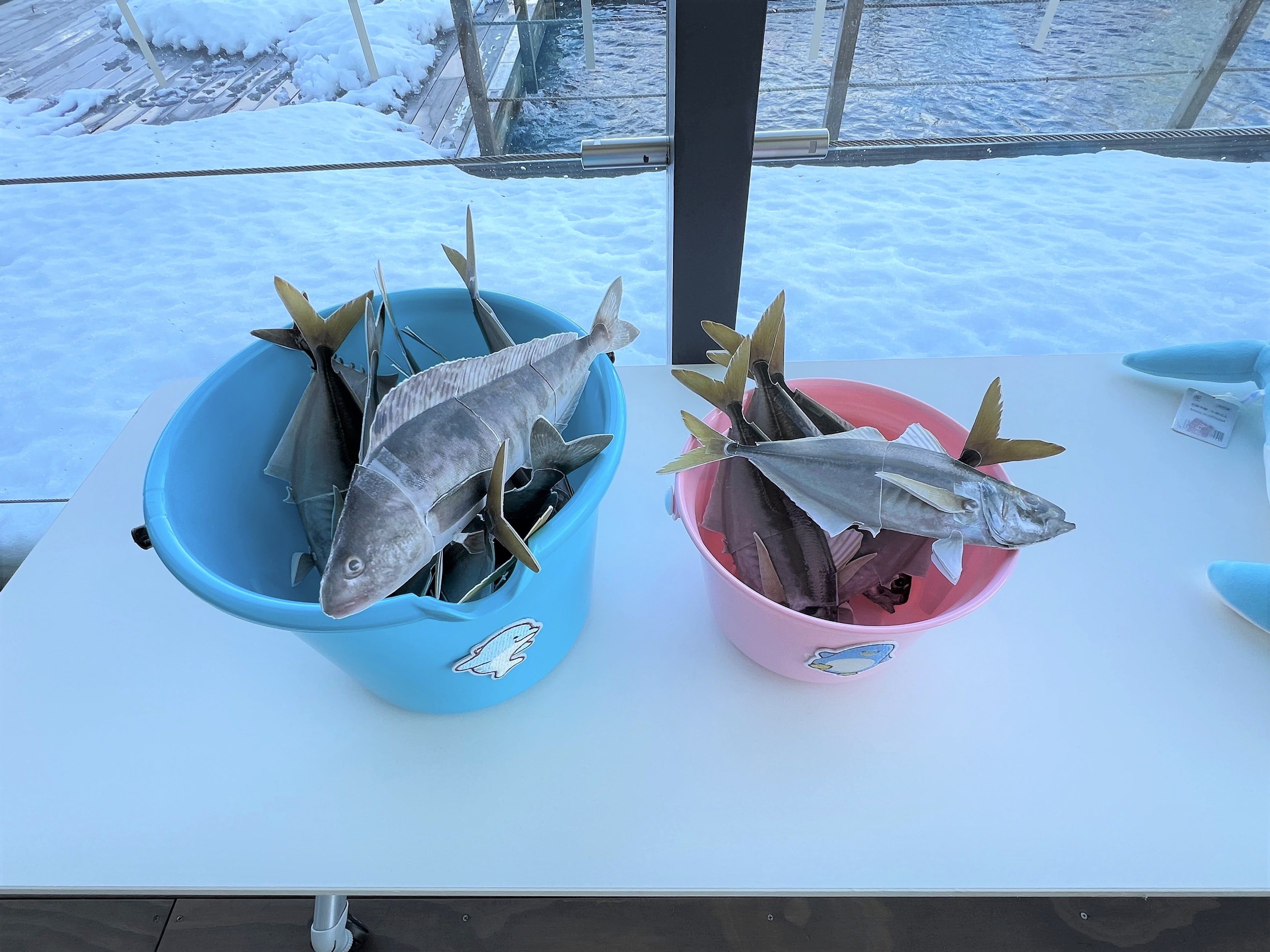 給餌で使用するエサのアジが入ったバケツの重さを体験できるコーナーもあります。