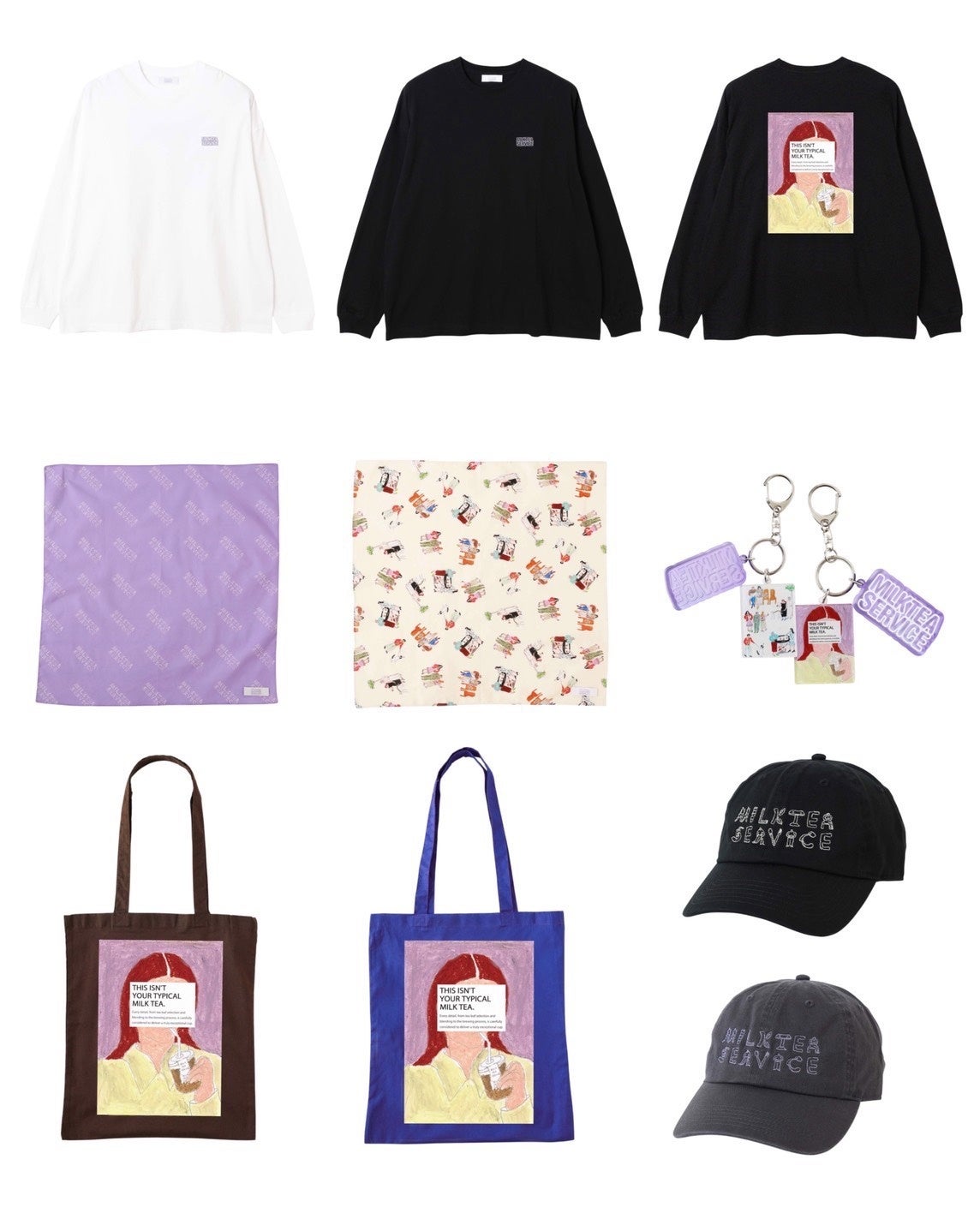 本コラボレーションでは、“ミルクティーを飲む時間”にフォーカスし、日常の中にある穏やかで豊かなひとときを、「CONVENIENCE YOUNG」ならではの柔らかなタッチで表現。全3種類のアートワークを、ロングスリーブTシャツ、キャップ、バンダナ、キーホルダー、トートバッグの5アイテムに落とし込みました。