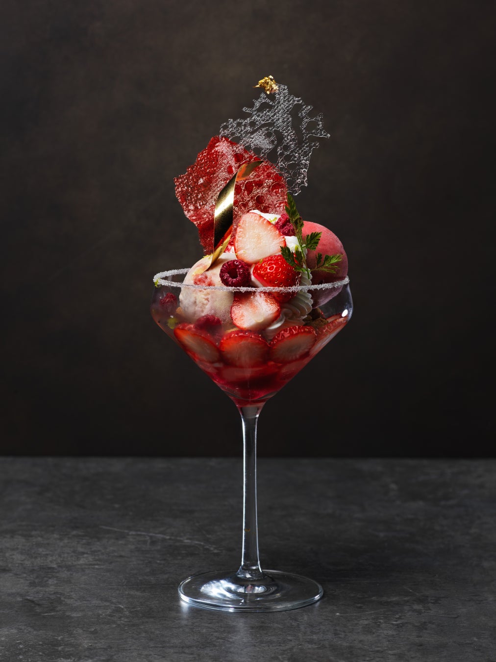 濃厚なバニラアイスに苺のコンポートをマーブル状に合わせた「グラスフレーズバニーユ」と華やかな甘みと酸味がひろがる「苺とフランボワーズのソルベ」を使用した、ベリーづくしの一品。