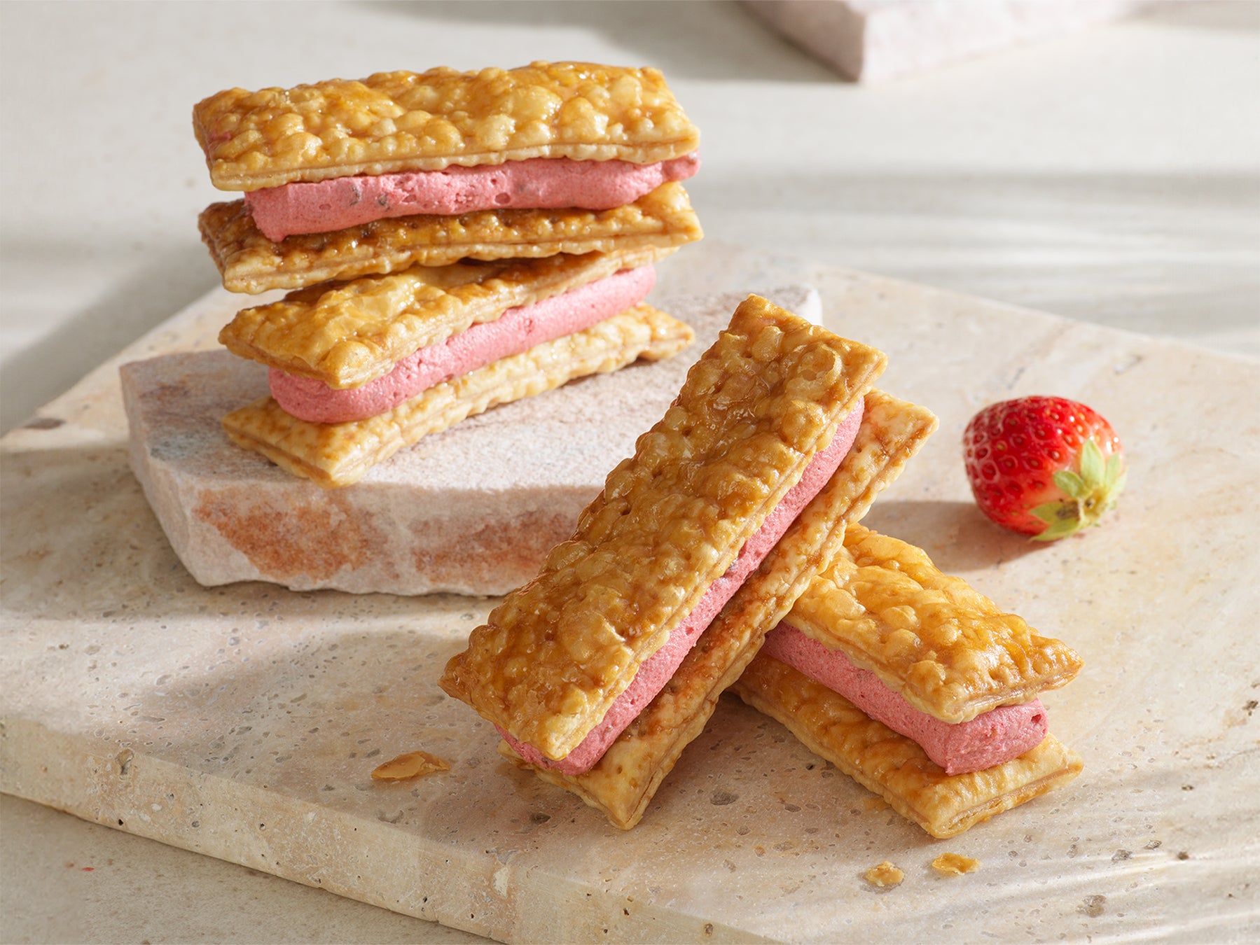 北海道産の発酵バターを使用したサクサクのパイで、甘酸っぱい苺クリームをサンドしたスイーツ。苺クリームには、小さくカットした苺がしのばせられ、甘酸っぱさが引き立てられます。サクっとしたパイと、厚めの甘酸っぱい苺クリームのコントラストをお楽しみいただけます。