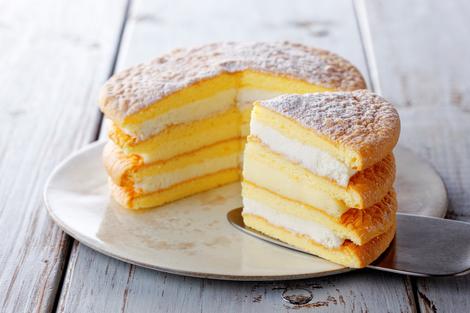 イタリア産リコッタを使ったミルクの自然な甘みが感じられるリコッタクリームと、ミルキーでコクのあるカスタードクリームを、はちみつ入りのふわふわのオムレット生地で交互にサンドしました
