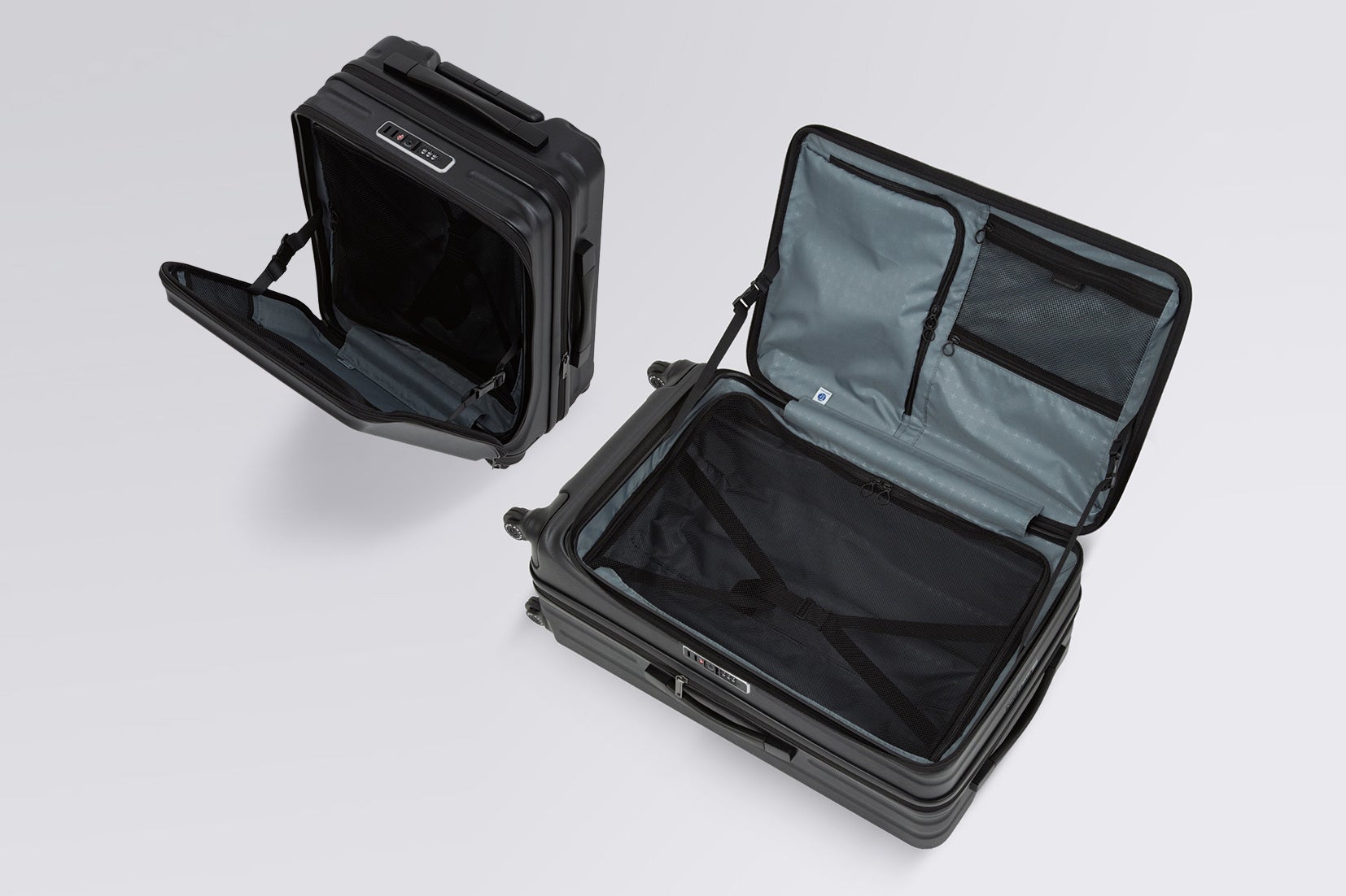 機内持込サイズは立てたまま出し入れできる「縦開き」、預け入れサイズは省スペースで開閉できる「横開き」仕様で、狭い空間でも快適に使えます。