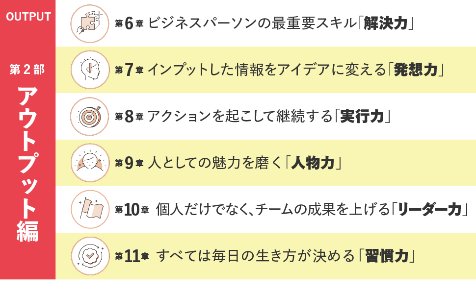 第1部は、インプットをコントロールするための「数字力」「発見力」「勉強力」「読書力」「時間力」の磨き方を、第2部はアウトプットを最適化するための「解決力」「発想力」「実行力」「人物力」「リーダー力」と、そのアウトプットが継続するための「習慣力」の鍛え方、磨き方を解説しています。