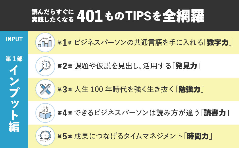 - 数字力、勉強力、解決力など11のスキルの401ものTIPSを全網羅!