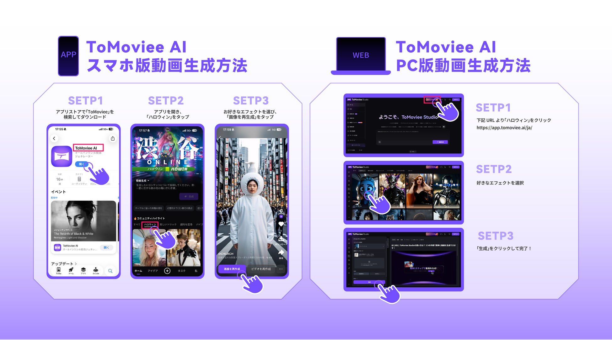 ToMoviee AIには、まるで渋谷ハロウィンに参加しているような気分が感じられるハロウィンテンプレートを多数公開中です。この機会にToMoviee AIの動画生成をお楽しみください。