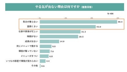 やる気が出ない理由を聞いたところ、「気分が乗らない」が59.4%と最も多く、次いで「面倒くさい」が43%という結果に。おうちフィットネスを行う人が多い一方で、モチベーションの維持が課題になっていることがわかりました。