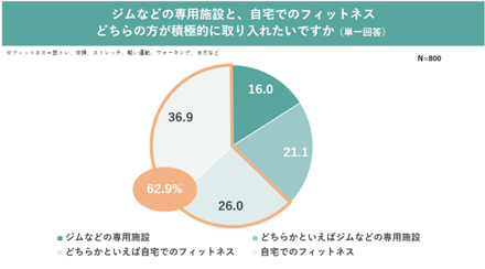 ■「ジムなどの専用施設」と「自宅」でのフィットネス、積極的に取り入れたいのは「自宅」で62.9%