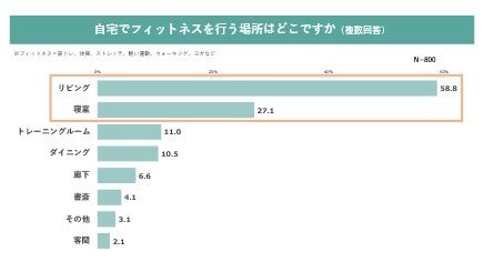 自宅でフィットネスを行う場所を聞いたところ「リビング」が58.8%で1位に。次いで「寝室」が27.1%となり、家の中でも比較的広いスペースを取れるリビングが、日々のフィットネススペースになっているようです。