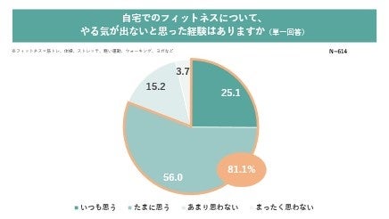 自宅でのフィットネスについて「やる気が出ないと思った経験はあるか」と聞いたところ、「いつも思う」が25.1%、「たまに思う」が56%となり、8割以上がやる気が出ないと思った経験があることが判明。