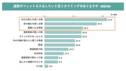 フィットネスをしたいと思うタイミングを聞いたところ、「体力の衰えを感じる時」が42.9%で1位という結果に。次いで「体の緩みを感じる時」が35.9%となり、年齢を重ねて体の変化を感じたときに運動を意識する人が多いことが伺えます。さらに、「薄着になる季節」が26.5%で3位となり、暑さを感じるこれからの時季はまさに運動への関心が高まることがわかりました。