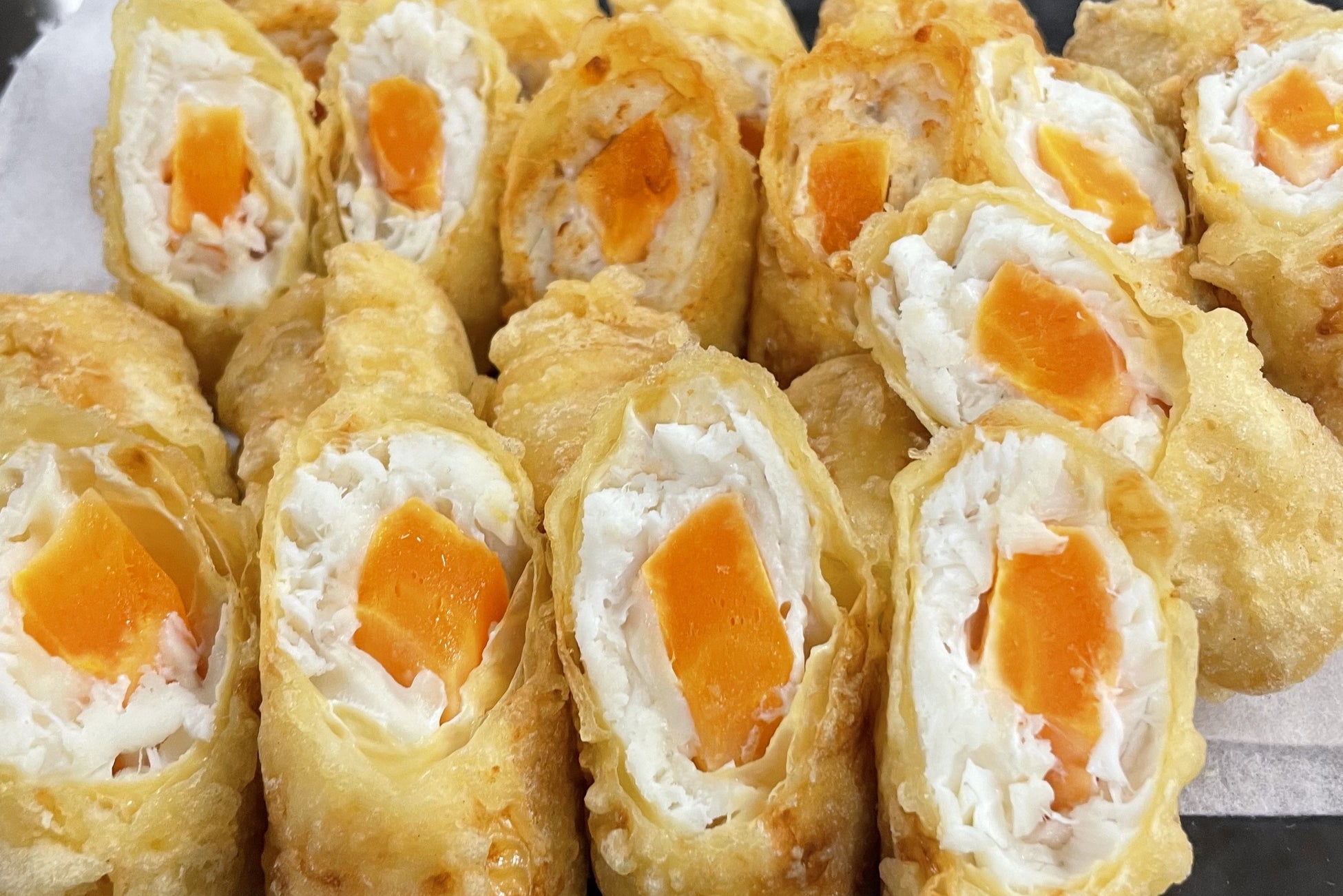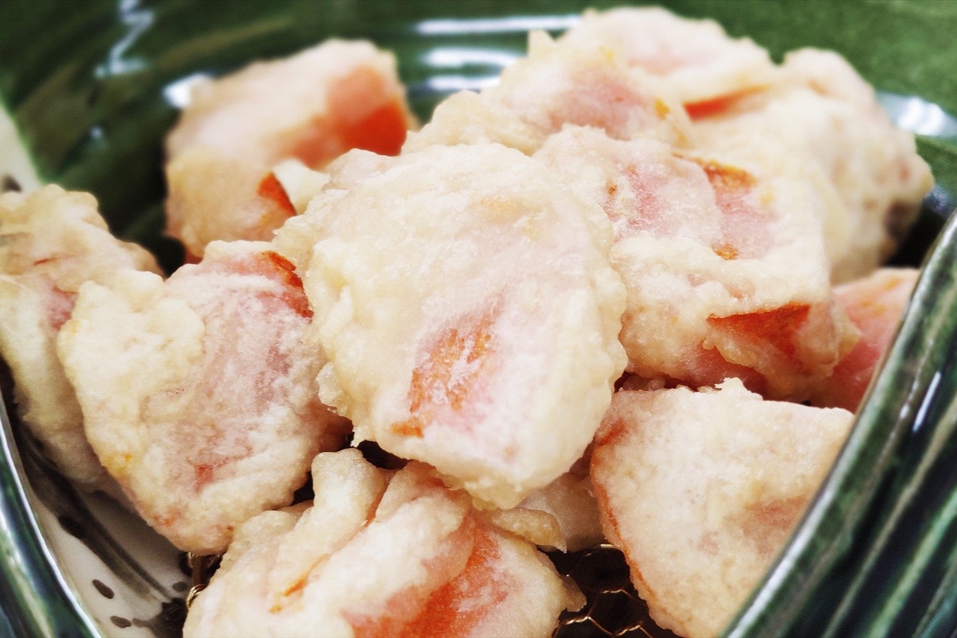 会席料理:春にんじんと淡路島玉ねぎの平天/春にんじんと鳴門鯛の東寺揚げ