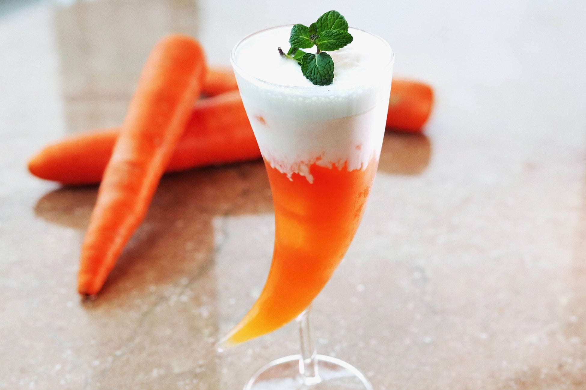 ◎ノンアルコール:キャロットスムージー(人参ジュース+すだち酢+フォームミルク)