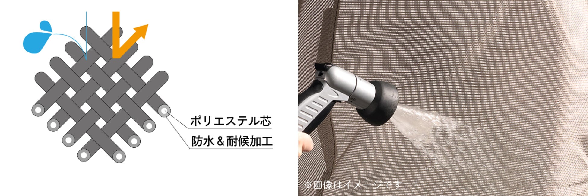 また、生地には耐候性・耐水性・通気性に優れたテスリンメッシュを採用しました。一般的なポリエステル生地と異なり、ポリエステル糸にコーティングを施しているため、汚れが付きにくく水洗いもできるため、お手入れが簡単です。通気性も抜群なので、汗をかいたままでも蒸れやべたつきが少ないほか、海や川で遊んだ後に濡れた水着のままくつろぐこともできるため、スポーツ時や水辺でのレジャーでも使用できます。