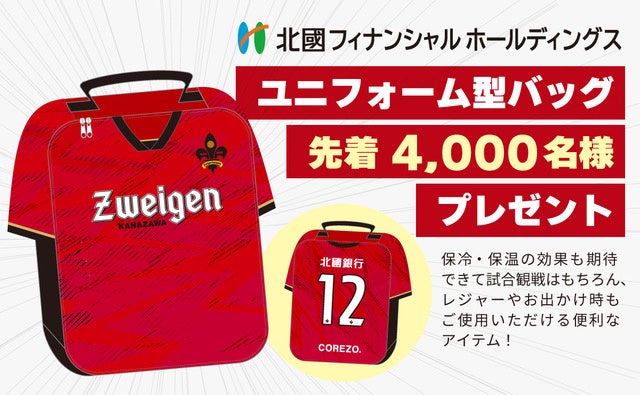 公益社団法人日本プロサッカーリーグ(J3リーグ)のツエーゲン金沢は、10月6日(日)に金沢ゴーゴーカレースタジアムで開催されるツエーゲン金沢vsテゲバジャーロ宮崎戦の試合会場で、先着4,000名様にユニフォーム型バッグをプレゼントいたします。