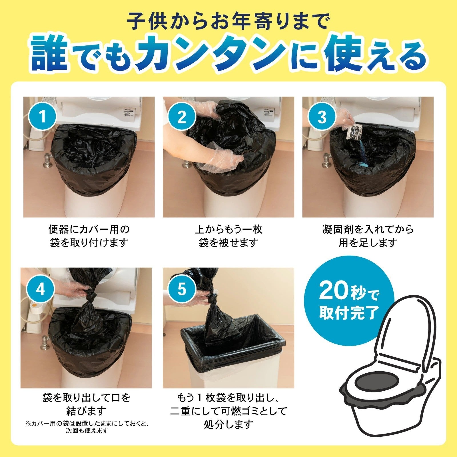 袋と凝固剤をセットするだけで使用可能。災害時でも迷わず使えるシンプル構造です。