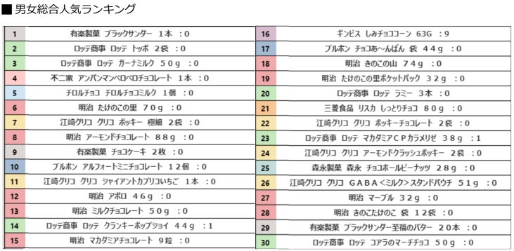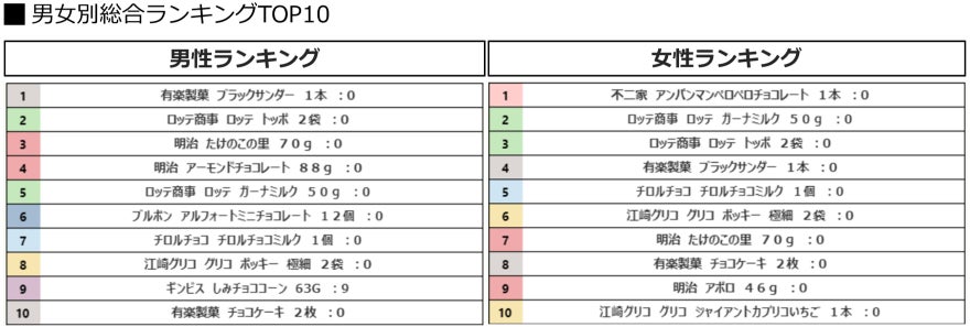 - 男性1位は「ブラックサンダー」、女性1位は「アンパンマンペロペロチョコレート」