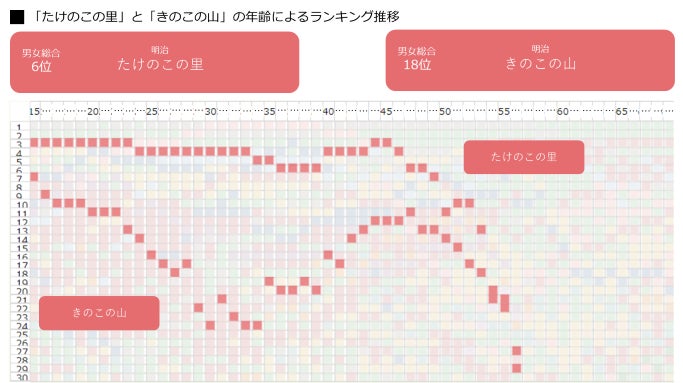 男女総合ランキングでは、6位が「たけのこの里」、18位に「きのこの山」と、国民大調査と同じように「たけのこの里」の方が人気が高い結果となりました。年齢によるランキング推移を見てみると、どちらも50代に入るとランキングが下降していきますが、「たけのこの里」は45歳まで6位~3位を維持し、「きのこの山」は、15歳の7位から30歳の24位までランキングが下降し、その後中高年層では47歳の11位まで盛り返す特徴的な動きをみせています。若年層では「きのこの山」よりも「たけのこの里」のほうが人気なのかもしれません。
