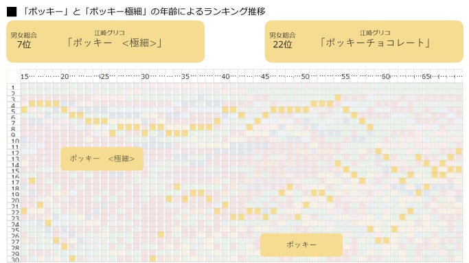 総合ランキングでは7位と、通常のポッキーよりもランキングが高い結果となりました。年齢による推移については「トッポ」と似ており、54歳まで3~9位を維持した後、年齢とともにランキングが下降しています。通常のポッキーは1966年に発売され、その後2007年に極細タイプが登場したため、年齢が高い方には通常のポッキーの方が馴染みがあり、若年層には極細ポッキーが人気なのかもしれません。