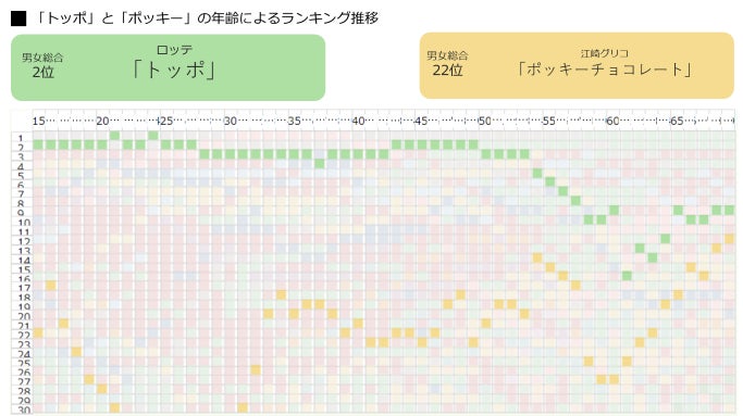 総合ランキングではロッテ「トッポ」が2位、江崎グリコ「ポッキーチョコレート」が22位と、「トッポ」の方が人気が高い結果となりました。「トッポ」は53歳まで1~3位を維持し、その後下降しています。対して「ポッキーチョコレート」は10代から下降するものの30代で再度上昇し、その後年齢とともにランキングがアップしていました。若年層の「トッポ」人気が高いのは、外でシェアして食べる機会が多く、チョコレートが溶けても手につかないといった理由から選んでいるのかもしれません。