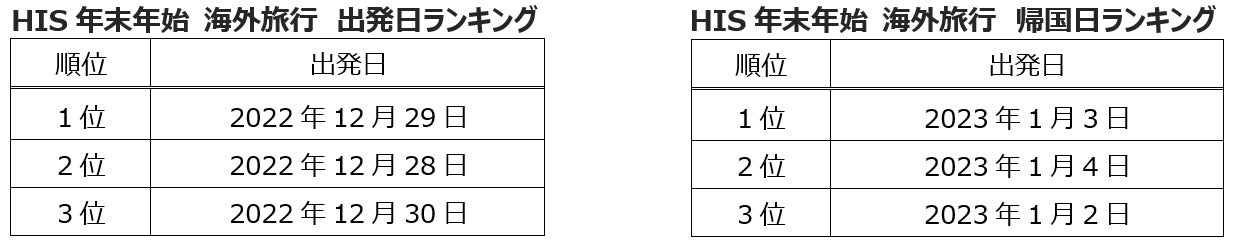 株式会社エイチ・アイ・エス(本社:東京都港区 以下、HIS)は、今年の年末年始(2022年12月24日~2023年1月3日)の予約状況から、海外旅行動向について下記のとおりにまとめました。
