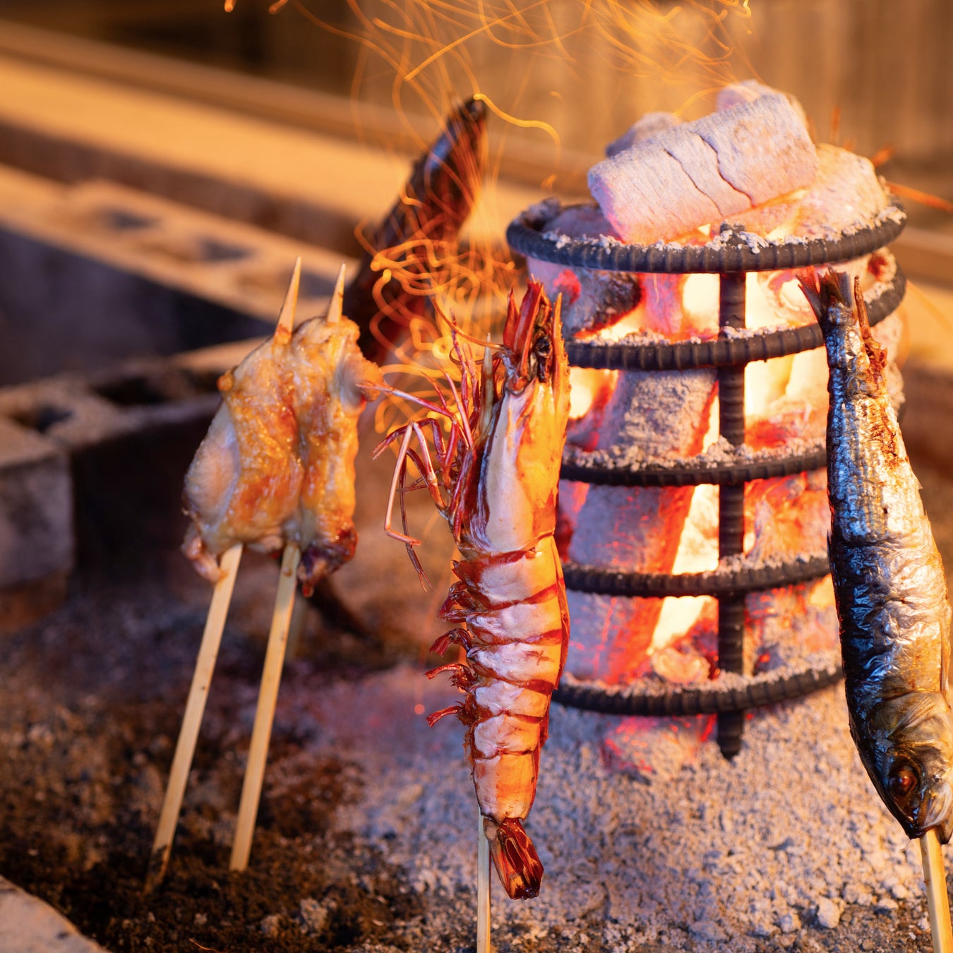 厳選された素材の持ち味を最大限に引き出し、職人が丹精込めて炭火で焼き上げた炉端焼きと原始焼きが楽しめる「炭火炉端と肉 金しゃもじ」。魚介・肉・野菜を遠火強火の遠赤外線効果でじっくりと焼き上げることで、表面はパリッと香ばしく、中はふっくらとジューシーに仕上がります。