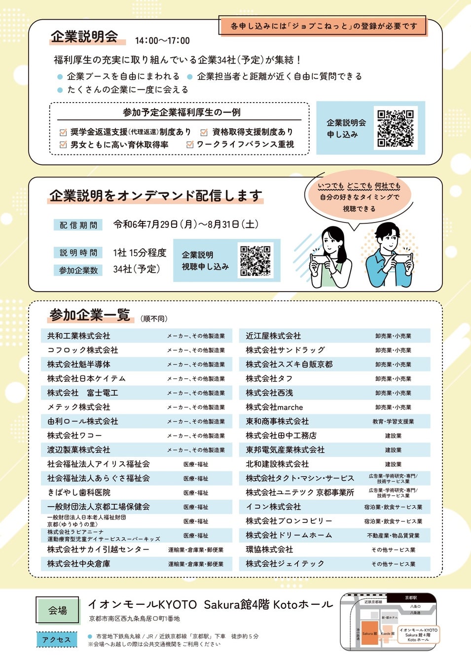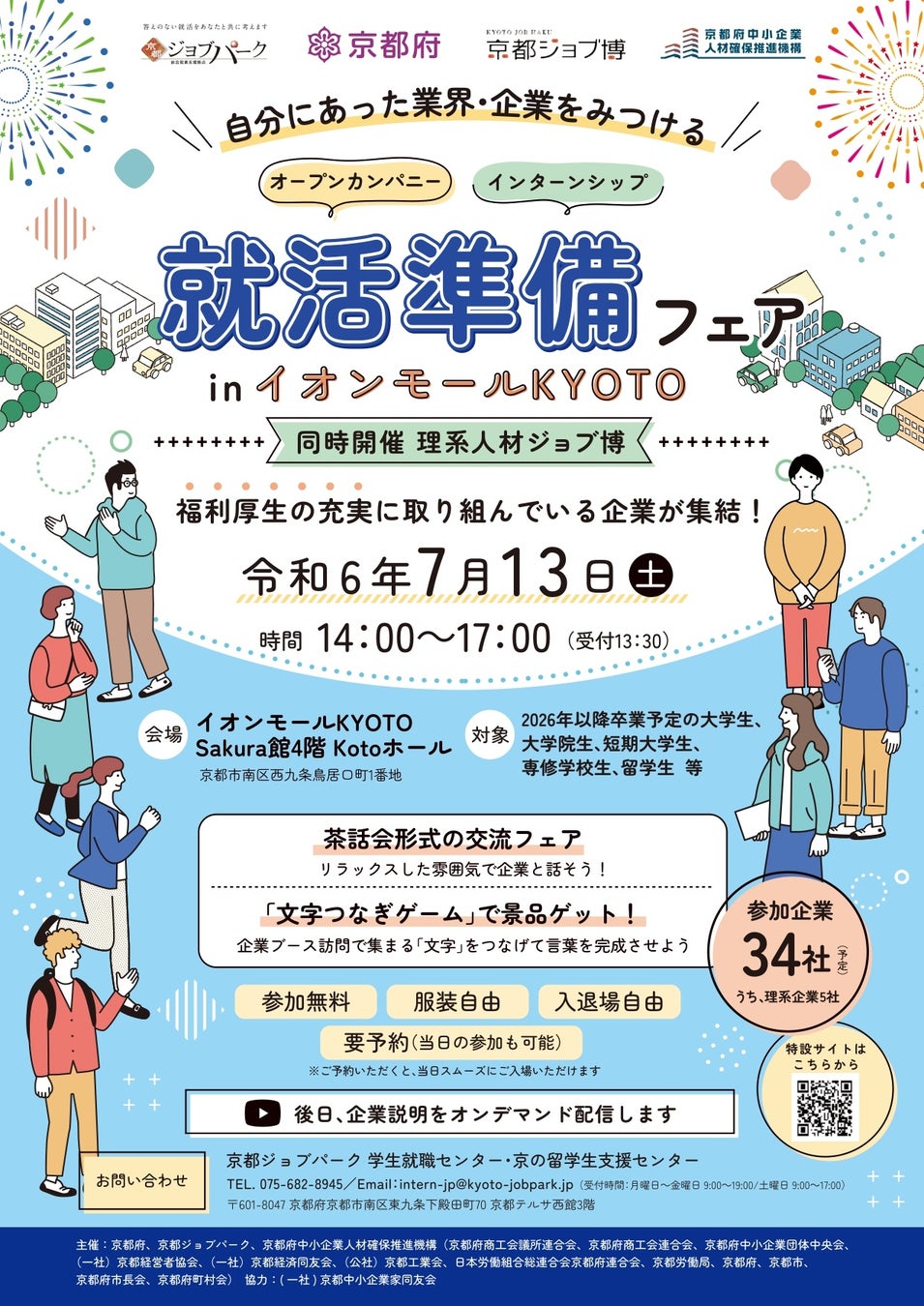 主催:京都府、京都ジョブパーク、京都府中小企業人材確保推進機構(京都府商工会議所連合会、京都府商工会連合会、京都府中小企業団体中央会、(一社)京都経営者協会、(一社)京都経済同友会、(公社)京都工業会、日本労働組合総連合会京都府連合会、京都労働局、京都府、京都市、京都府市長会、京都府町村会)