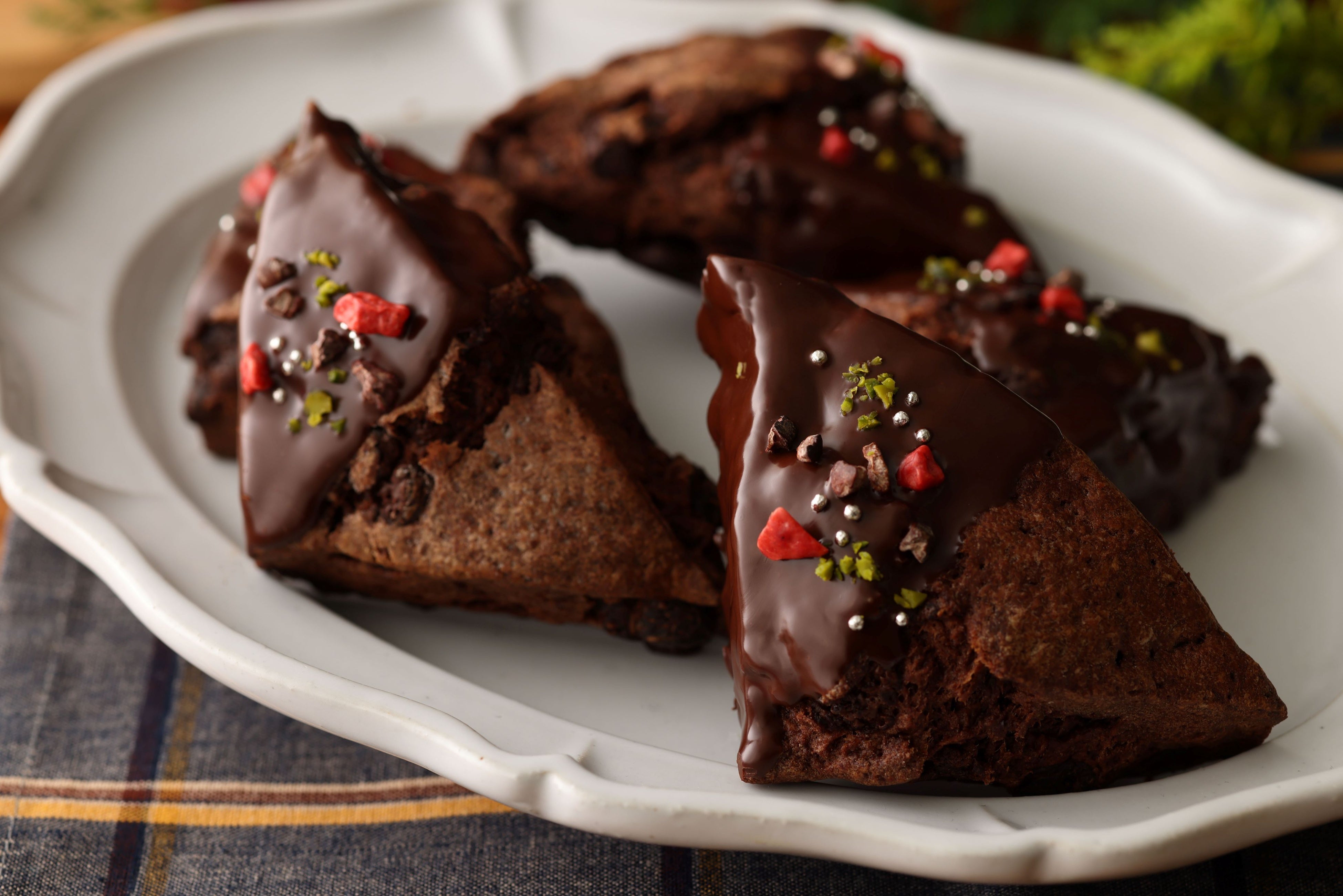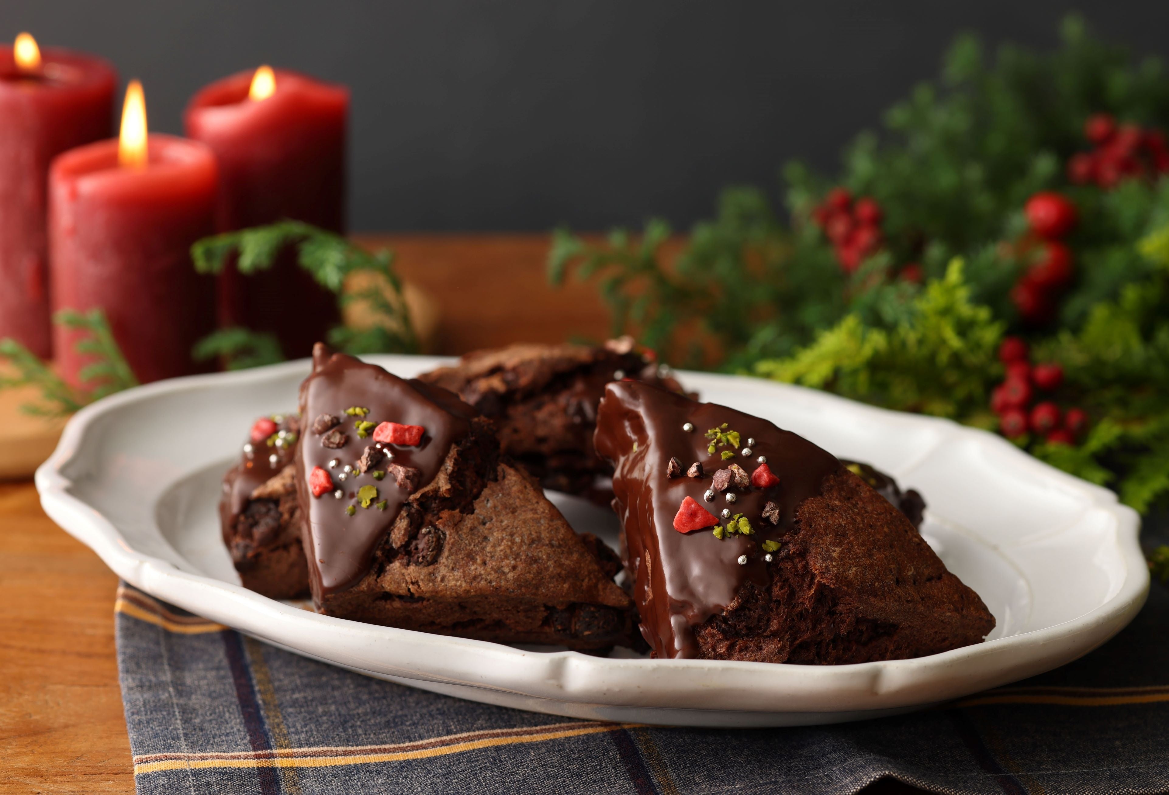 大粒チョコレートをたっぷり混ぜこんだココア生地にダークチョコレートをかけ、アラザンやピスタチオをトッピングしたクリスマス限定スコーン。