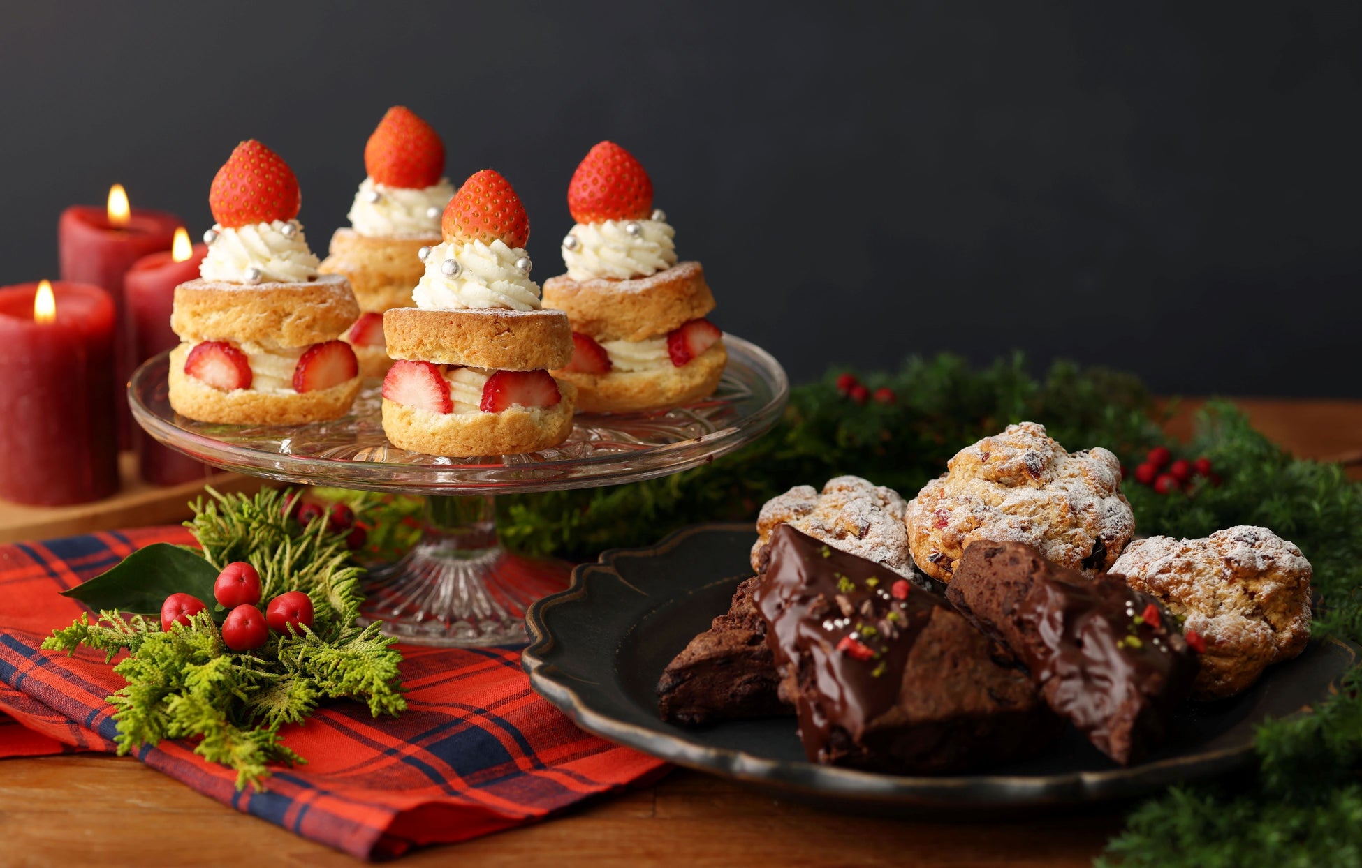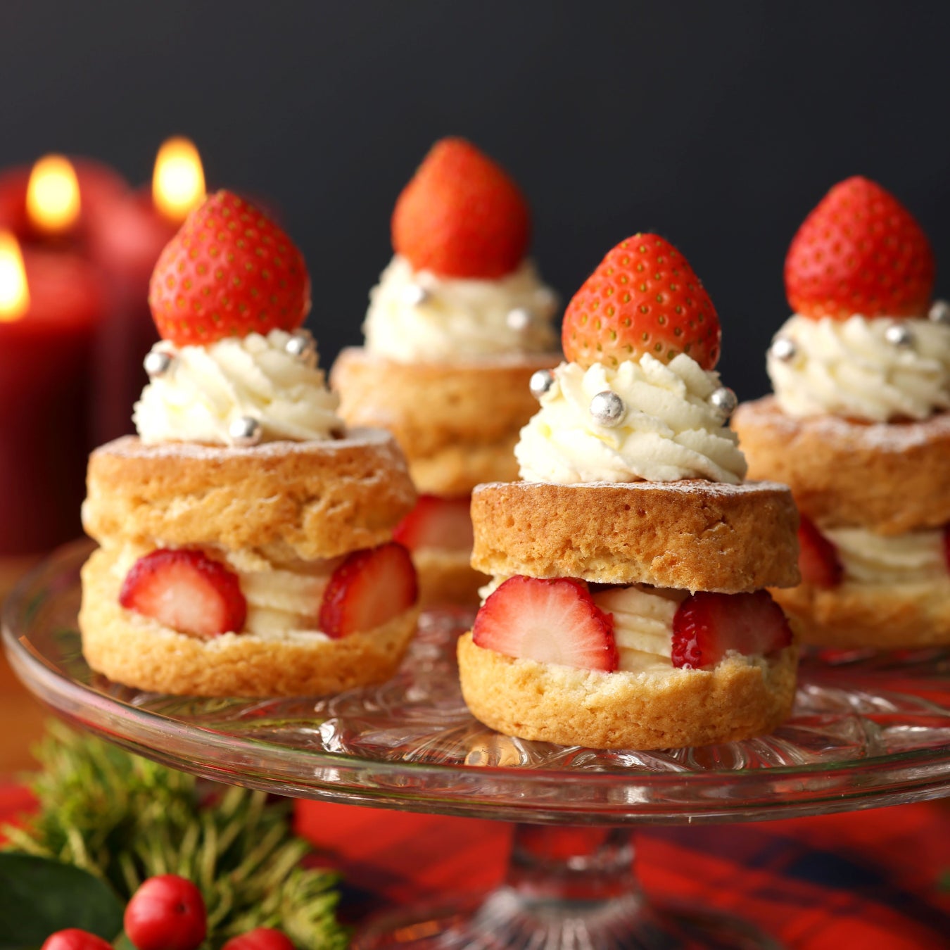 バターミルクスコーンに特製ホワイトチョコクリームをサンドし、ロウソクの炎に見立ててフレッシュ苺をのせたクリスマスのスペシャルスコーンサンド。