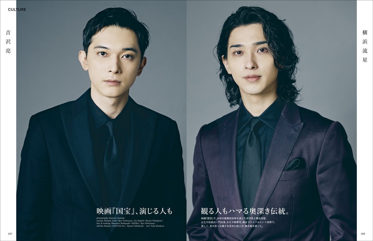 映画『国宝』で、女形の歌舞伎役者を演じた吉沢亮と横浜流星。かたや任侠の一門出身、かたや御曹司、親友でライバルという役柄で、美しく、息の合った踊りを見せた両人が、舞台裏を語った。