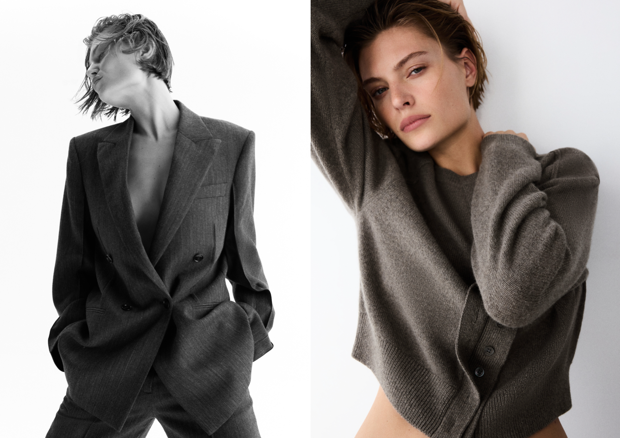 ラインナップには、ワイドスリーブにステッチ入りのクリースを施し、切りっぱなしの縫い代が印象的なダブルブレストのウールブレザーや、ダブル前立てとショルダーレイヤーを備えたコンパクトなカシミアカーディガンが登場します。