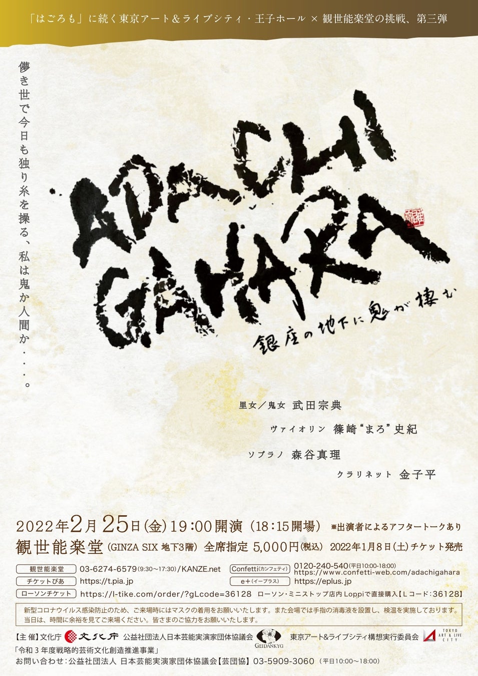 文化庁/公益社団法人日本芸能実演家団体協議会/東京アート&ライブシティ構想実行委員会主催公演、『「ADACHIGAHARA」-銀座の地下に鬼が棲む』が2022年2月25日 (金)に観世能楽堂(GINZA SIX 地下3階)(東京都中央区銀座6-10-1GINZA SIX 地下3階)にて上演されます。チケットはカンフェティ(運営:ロングランプランニング株式会社、東京都新宿区、代表取締役:榑松 大剛)にて発売中です。